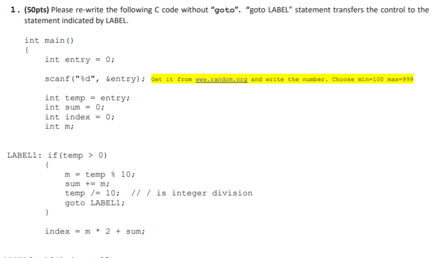 Goto and labels in c. The GNU C Reference Manual You can use goto statements to simulate loop statements, but we do not recommend it—it makes the program harder to read, and GCC cannot optimize it as well. You should use for, while, and do statements instead of goto statements, when possible. As an extension, GCC allows a goto statement to jump to an address specified by a void* variable. Goto - Wikipedia GoTo (goto, GOTO, GO TO or other case combinations, depending on the programming language) is a statement found in many computer programming languages.It performs a one-way transfer of control to another line of code; in contrast a function call normally returns control. The jumped-to locations are usually identified using labels, though some languages use line numbers. goto statement in C/C++ - GeeksforGeeks Aug 26, 2019 · Here label is a user-defined identifier which indicates the target statement. The statement immediately followed after ‘label:’ is the destination statement. The ‘label:’ can also appear before the ‘goto label;’ statement in the above syntax. Below are some examples on how to use goto statement: Examples: Statements - cppreference.com Sep 25, 2022 · A label with an identifier declared inside a function matches all goto statements with the same identifier in that function, in all nested blocks, before and after its own declaration. Two labels in a function must not have the same identifier. Besides being added to a statement, labels can also be used anywhere in compound statements.